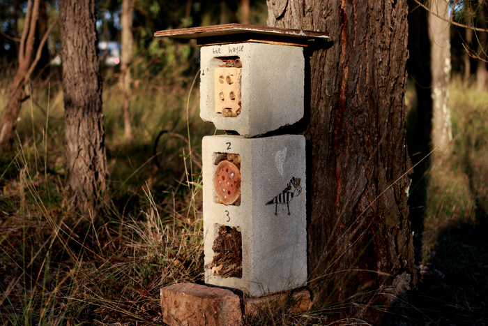 Solitary native bees can be encouraged by providing nesting habitats. Little Eco and I created a bee hotel (also known as trap nests and bee condos) out of old concrete blocks filled with nesting material. We included bamboo canes, making sure to leave a joint to close the back of the stem; a piece of hardwood with holes drilled in it, each 3 – 9 mm wide and at least 80 mm deep; and naturally holey bits of rotten timber. There’s a roof to protect the nests from rain and it’s placed against a tree to protect the rear.