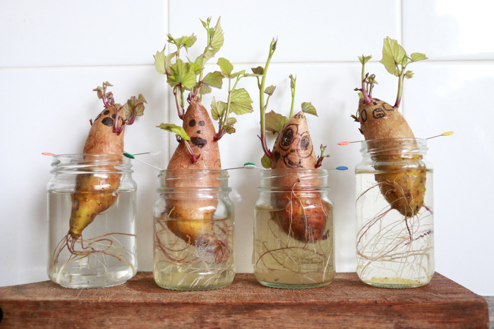 We are growing sweet potato slips on our windowsill. Little Eco added faces to sweet potato tubers and we’re watching their roots, shoots and character grow. It’s an activity that combines creativity, nature study and growing your own food. Win-win.