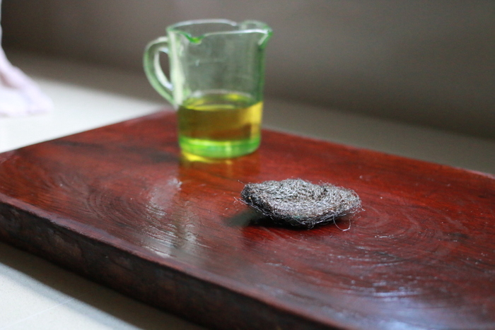 Apply a generous amount of food-grade oil and rub in with fine steel wool. I use vegetable oils such as rice-bran oil or olive oil because that’s what I have in my cupboard. Other options include walnut oil or grapeseed oil. Some suggest using mineral oil rather than vegetable oil because it’s less likely to go rancid. But I prefer not to use a petroleum product on something I prepare food on.
